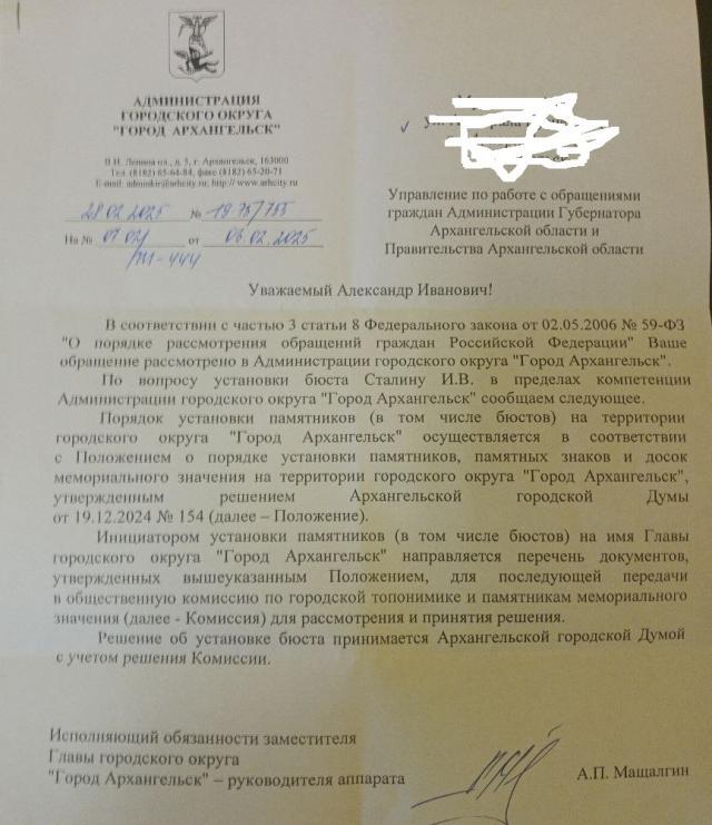 Затем обращение было перенаправлено в администрацию областного центра. Оттуда надысь ответили за подписью некоего Мащалгина, представившегося замом великолепного и руководителем аппарата.