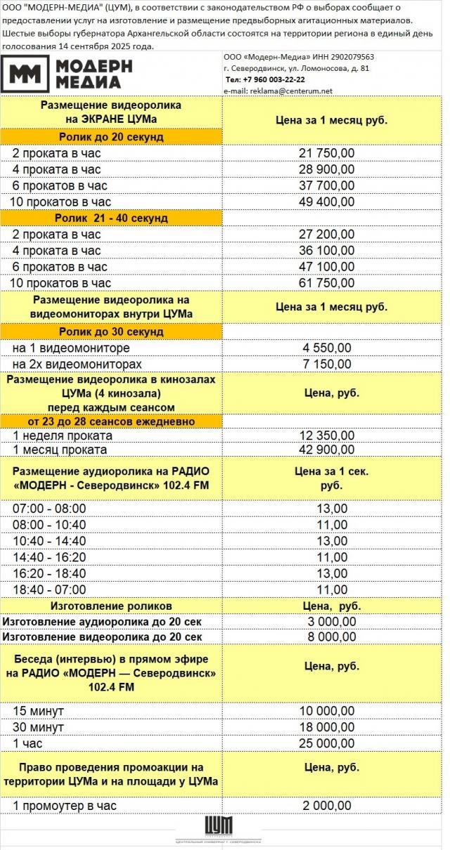 ООО «Модерн-Медиа» сообщает о расценках на размещение агитационных материалов