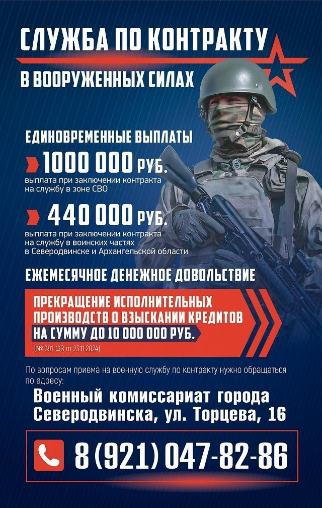 "Считаю, что корабелы, принимающие мужественное решение, должны чувствовать и поддержку своего города, поэтому к федеральной и региональной выплате будет добавлена и муниципальная – 200 тысяч рублей. Общая сумма выплат при заключении контракта на службу в зоне СВО составит 1 миллион рублей. Кроме того, дополнительная выплата от города в размере 50 тысяч рублей предусмотрена для жителей, которые заключают контракт на службу в воинских частях Северодвинска и Архангельской области. Общая сумма выплат - 440 тысяч рублей", - рассказал Игорь Арсентьев.