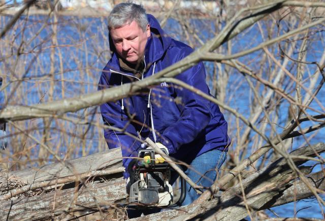 Картину маслом можно было наблюдать сегодня на берегу Северной Двины. Там градоначальник залез в кусты, которые нещадно кромсал. специально обученные люди его оберегали и обучали управлению сложнейшим агрегатом.