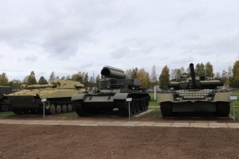 Это боевой танк Т-80БВ, самоходная артиллерийская установка «Гвоздика», плавающий бронетранспортёр, бронированный тягач, а также две дивизионные пушки и гаубица М-30.
