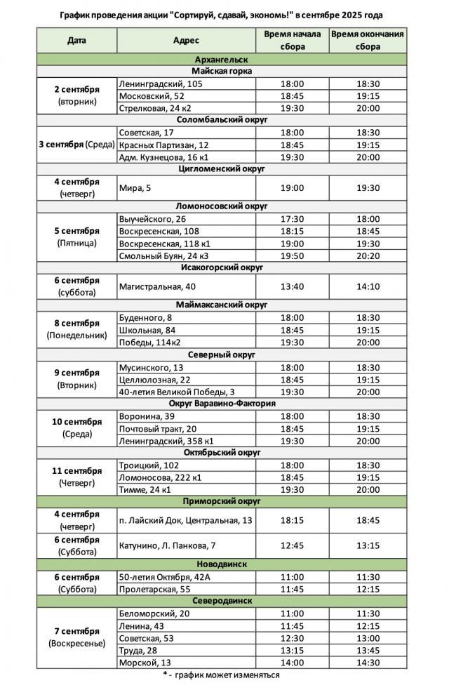 Регоператор «ЭкоИнтегратор» снова проведет акцию «Сортируй, сдавай, экономь!». Она пройдет со 2 по 11 сентября в Архангельске, Северодвинске, Новодвинске и Приморском округе – ищите ближайший адрес в графике.