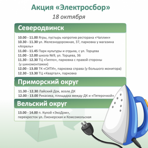 Уже в эту субботу 18 октября! Точки сбора будут организованы в Архангельске, Северодвинске, Новодвинске, Приморском и Вельском округах. Сломанную технику разбирают и отправляют на переработку, а рабочей – ищут новых хозяев.