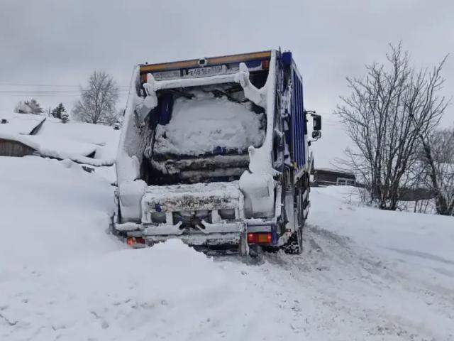 Из-за сложных погодных условий мусоровозы буксуют на заснеженных дорогах Поморья. Машины приходится откапывать почти в каждом дворе, а стокилограммовые контейнеры – выносить из сугробов на руках.