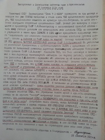 В своей пламенной речи на суде «архангельский Чаадаев» в частности сказал: «этот музей появился из-за ТРУСОСТИ руководства САФУ перед губернатором, которому взбрело в голову учредить его абсолютно без всяких оснований, ради пресмыкательства перед США дабы унизить Россию! Я настаиваю на удовлетворении всех моих исковых требований! – такое судебное решение докажет гражданскую честность правосудия и предупредит подобные затеи в других краях России»!»
