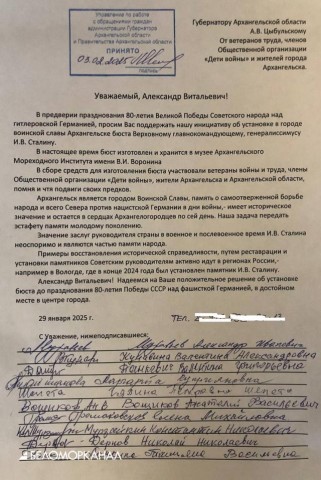 Архангельские ветераны труда, члены общественной организации "Дети войны" обратились к губернатору Архангельской области Александру Цыбульскому с просьбой поддержать инициативу горожан об установке в областном центре памятника Иосифу Сталину..