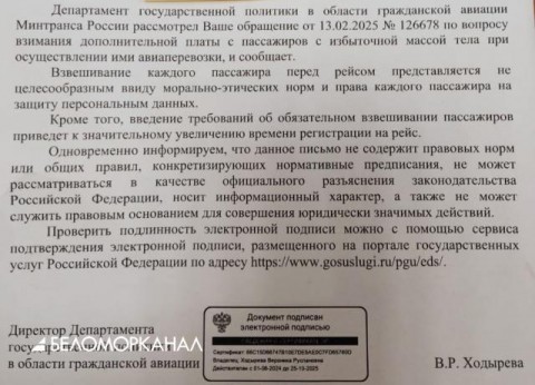 На что ему ответили, что «взвешивание каждого пассажира перед рейсом представляется не целесообразным ввиду морально-этических норм и права каждого пассажира на защиту персональных данным». Также добавили, что предрейсовое взвешивание пассажиров существенно увеличит время регистрации на рейс.