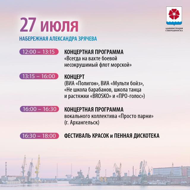 Администрация Северодвинска собрала программу празднования Дня города и Дня ВМФ в карточки-афиши. Не пропустите самое интересное.