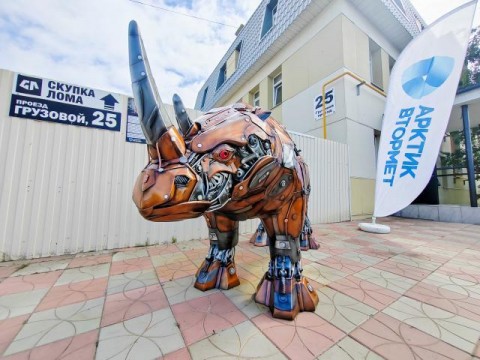 «АРКТИКВТОРМЕТ» - компания, специализирующаяся на скупке и переработке чёрного и цветного металлов, а также электронного лома, вновь привлекла внимание общественности установкой необычной скульптуры - Медного носорога.