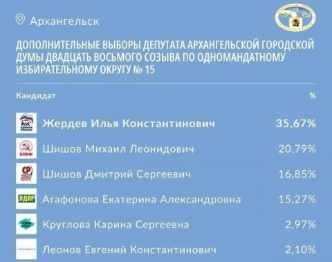 Илья Жердев одержал победу на довыборах по округу № 15 в Думу Архангельска.