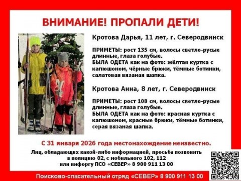 11-летняя Дарья Кротова и восьмилетняя Анна Кротова 31 января 2026 года ушли из дома и не вернулись.