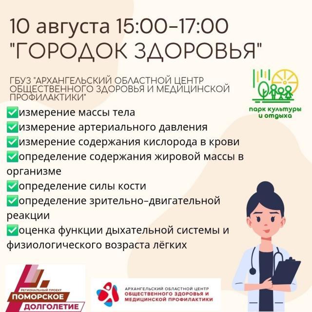 Спортивно-развлекательная программа «Город здоровья» состоится 10 августа с 12 до 18 часов в Парке культуры и отдыха. Событие пройдёт в рамках инициированных губернатором Архангельской области Александром Цыбульским проектов «Поморское долголетие» и «Здоровое Поморье».