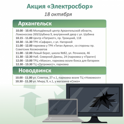 Уже в эту субботу 18 октября! Точки сбора будут организованы в Архангельске, Северодвинске, Новодвинске, Приморском и Вельском округах. Сломанную технику разбирают и отправляют на переработку, а рабочей – ищут новых хозяев.