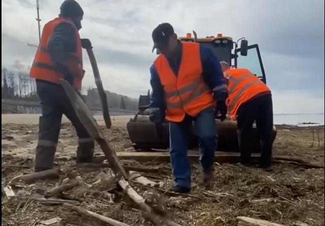 Сегодня пресс-служба АГА сообщает, что бригада предприятия «Чистый город» при поддержке трактора МУП «Городское благоустройство» очищает центральный городской пляж от веток, бревен и камней, принесенных ледоходом.