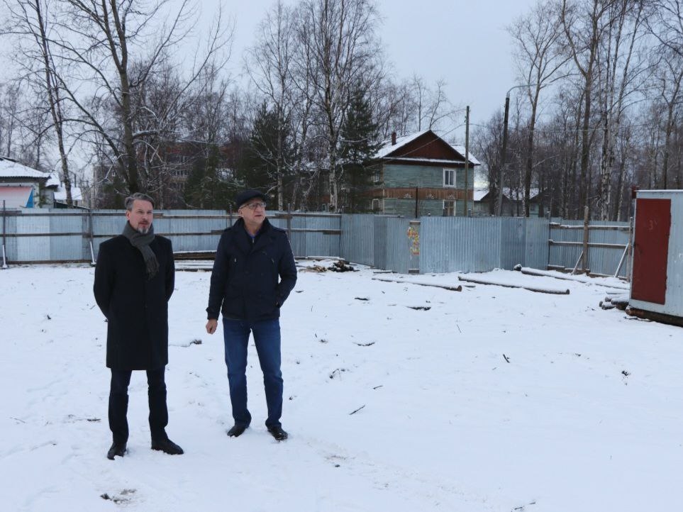 Стройка развернулась на пустыре напротив здания бывшего военкомата Минобороны России на проспекте Беломорском. С началом работ ознакомились городские депутаты. |